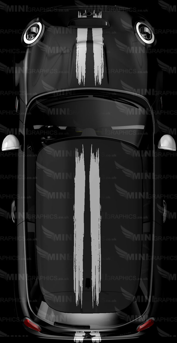 2 stripe brush viper stripes cut from vinyl. The design shows the cars colour as the background. The image shows silver vinyl on a Black MINI. The kit comes with Front bumper, bonnet, roof, boot and rear bumper sections.