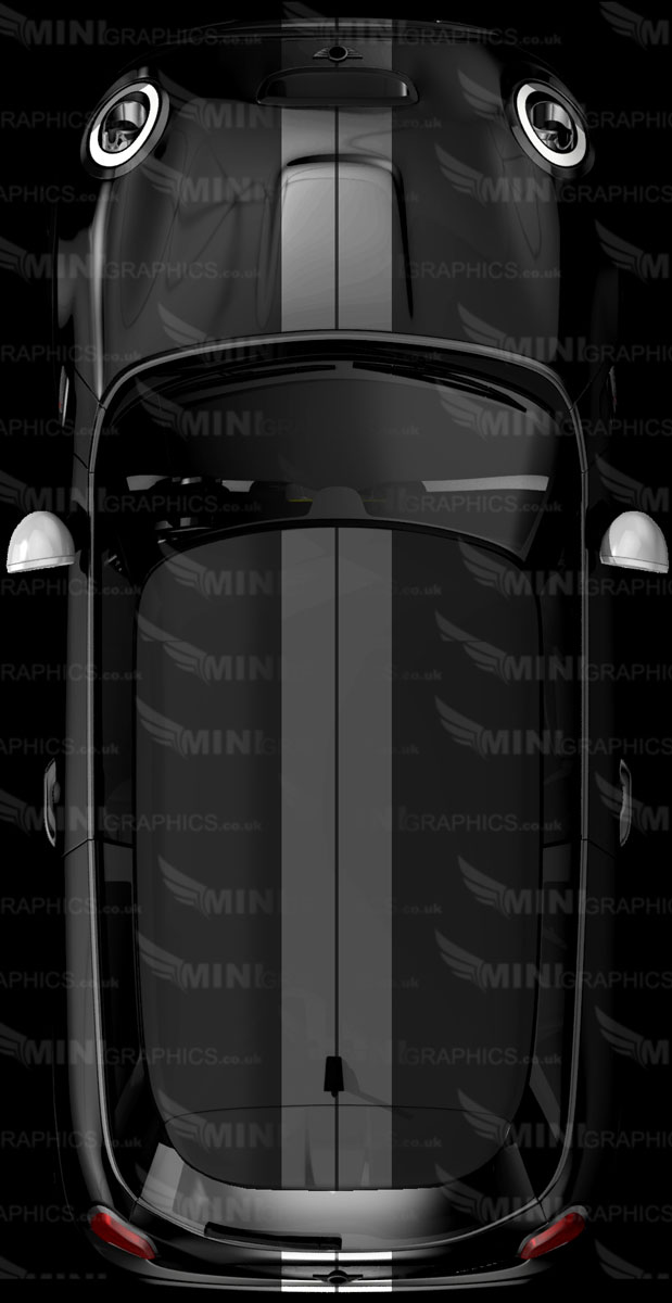 2 Stripe thinner viper stripes cut from vinyl. The design shows the cars colour as the background. The image shows silver vinyl on a black MINI. The kit comes with Front bumper, bonnet, roof, boot and rear bumper sections.