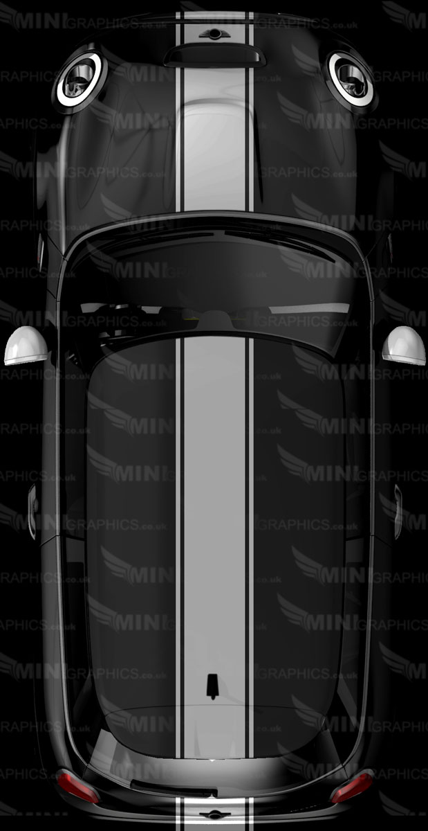 3 Stripe Viper Kit cut from vinyl. The design shows the cars colour as the background. The image shows Black vinyl on the body and Silver Vinyl on the roof. The kit comes with Front bumper, bonnet, roof, boot and rear bumper sections.