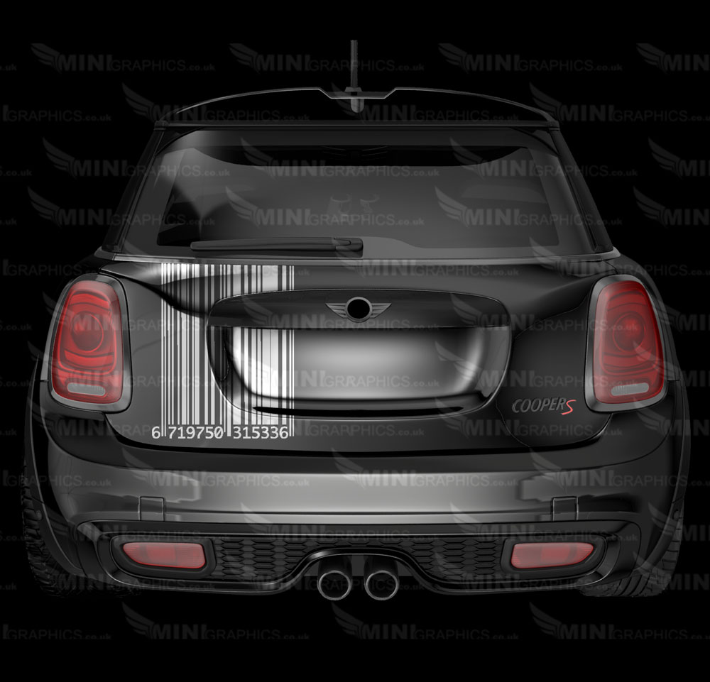 Barcode boot decal. The design shows the cars colour as the background. The image shows WHITE vinyl on a BLACK MINI.