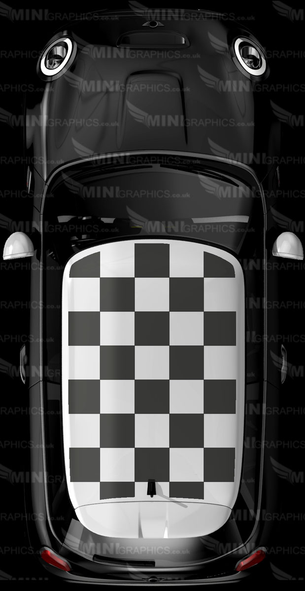Checkered Bordered roof graphic pattern. The design shows the cars colour as the background. The image shows Black vinyl on a White MINI.