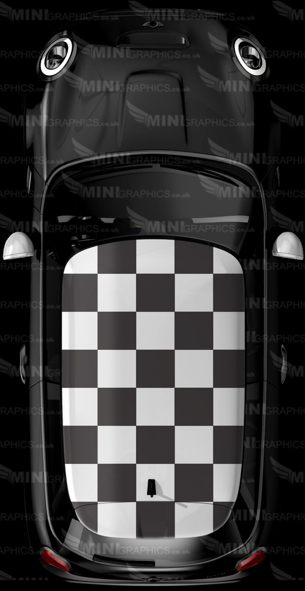 Checkered roof graphic pattern. The design shows the cars colour as the background. The image shows Black vinyl on a White MINI.