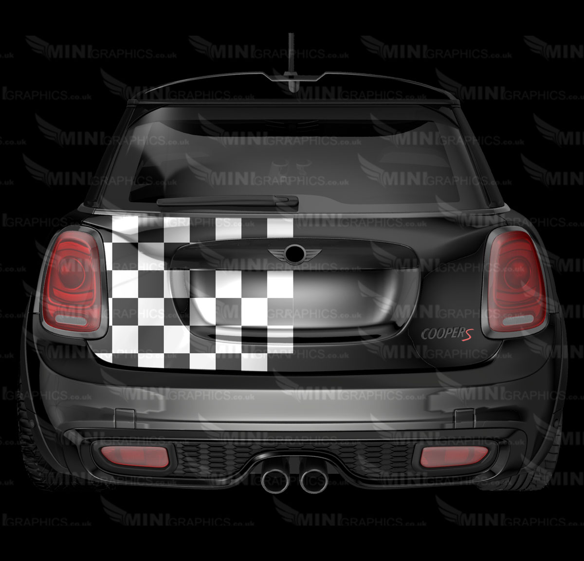 Checkered side flag boot decal. The design shows the cars colour as the background. The image shows Black vinyl on a White MINI.