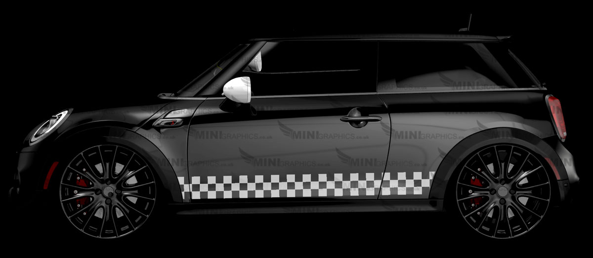 A Checkered pattern cut from vinyl. The design shows the cars colour as the background. The image shows White vinyl on a Black MINI.