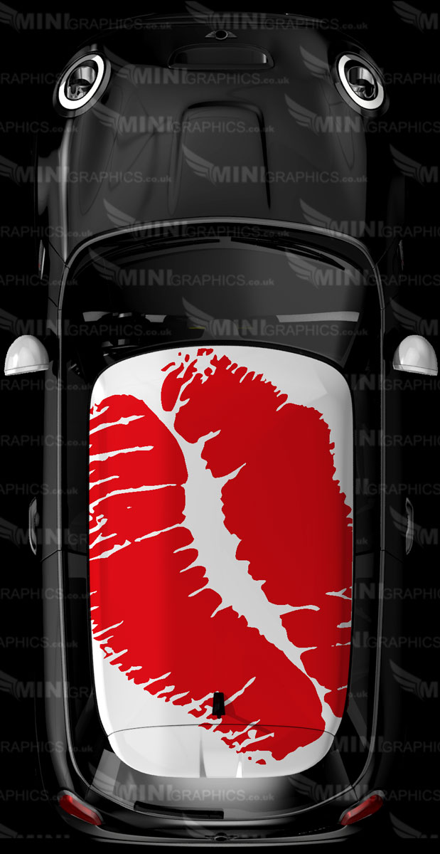 Kiss Lips roof Graphic. The design shows the cars colour as the background. The image shows red vinyl on a White MINI.
