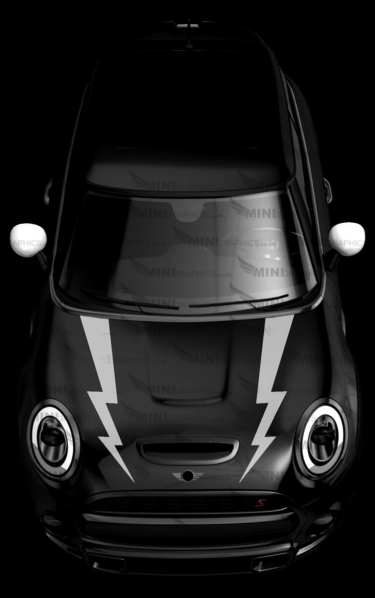 Lightning Bonnet stripes cut from vinyl. The design shows the cars colour as the background. The image shows White vinyl on a Black MINI.