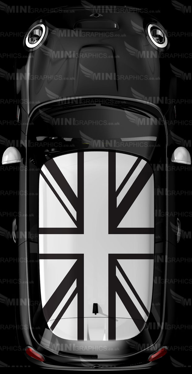 MONO Union Jack roof Graphic pattern. The design shows the cars colour as the background. The image shows Black vinyl on a White MINI.