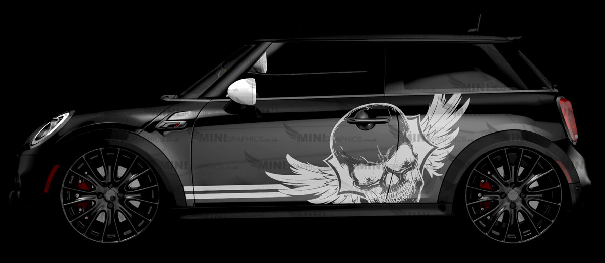 A Skull pattern cut from vinyl. The design shows the cars colour as the background. The image shows Black vinyl on a white MINI.