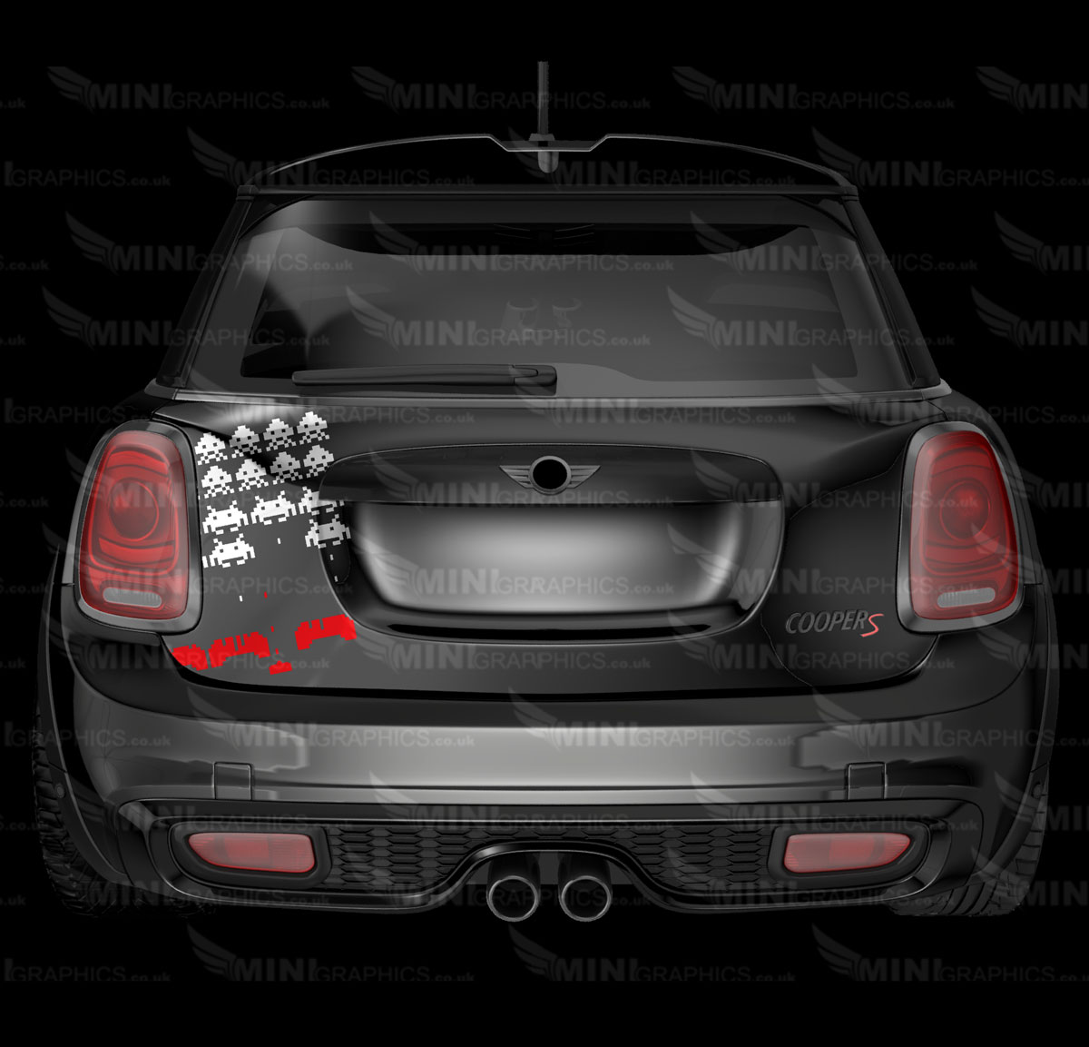 Space invaders boot graphic for the MINI range. Image shows black aliens and red ship on a white MINI.