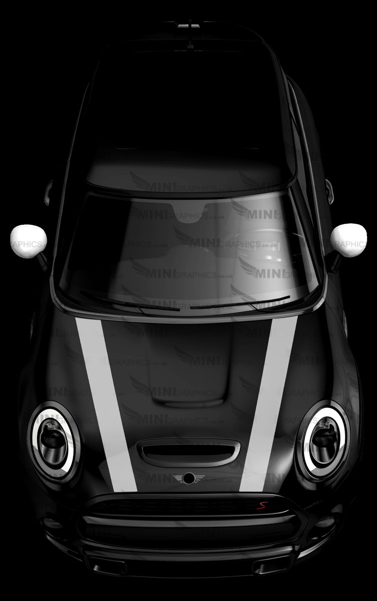 Standard bonnet stripes cut from vinyl. The design shows the cars colour as the background. The image shows White vinyl on a Black MINI.