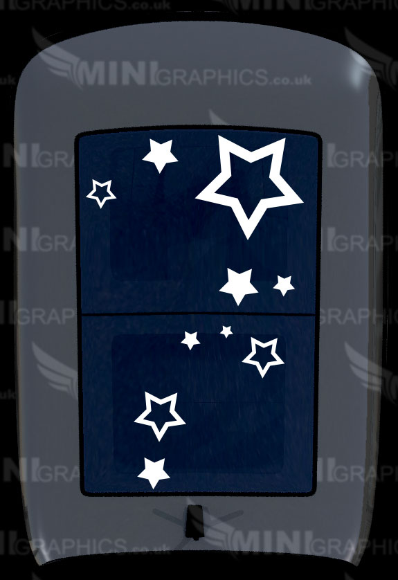 Stars sunroof Graphic. The design shows the cars colour as the background. The image shows White vinyl on a glass sunroof.