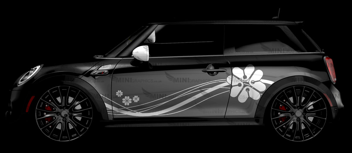 A Tech Floral pattern cut from vinyl. The design shows the cars colour as the background. The image shows SILVER vinyl on a Black MINI.