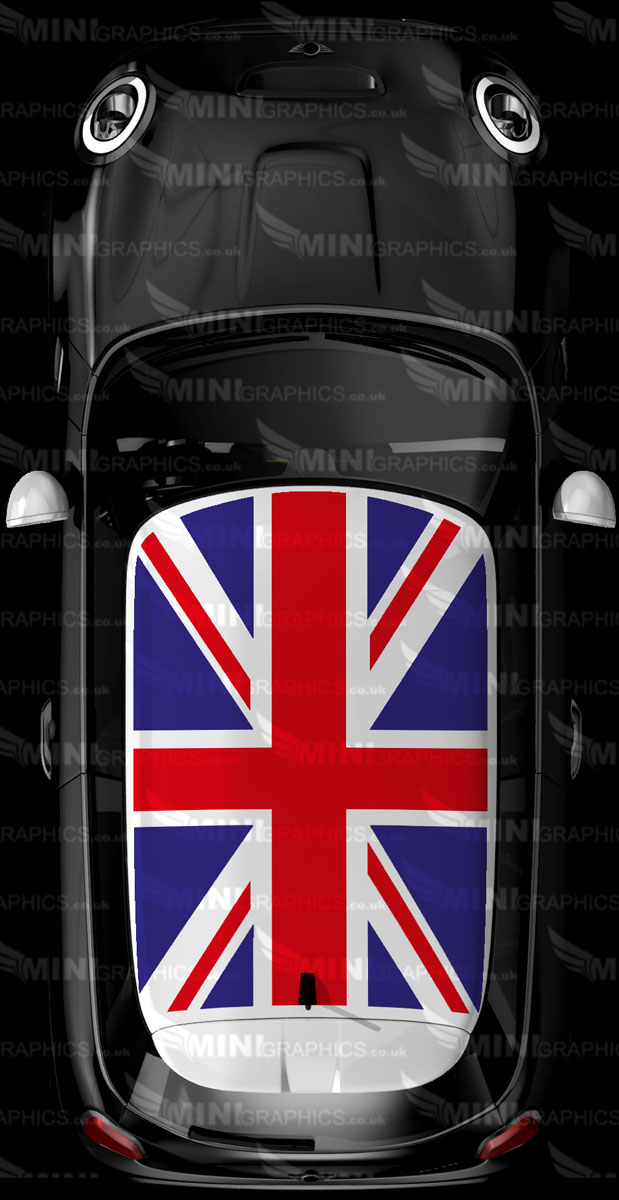 Union Jack Bordered roof Graphic pattern. The design shows the cars colour as the background. The image shows Red and Blue vinyl on a White MINI.