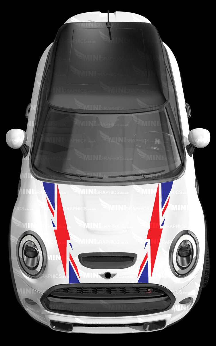 Union Jack skew bonnet Graphics pattern. The design shows the cars colour as the background. The image shows red and blue vinyl on a Black MINI.