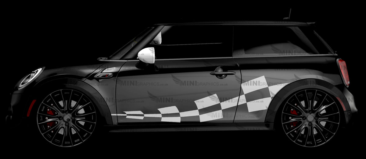 A checkered wave pattern cut from vinyl. The design shows the cars colour as the background. The image shows White vinyl on a Black MINI.