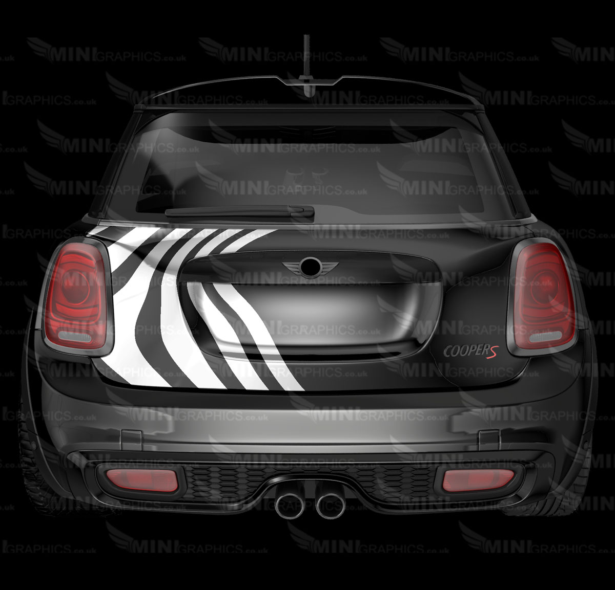 Zebra boot graphic. The design shows the cars colour as the background. The image shows white vinyl on a black MINI.